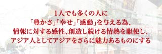 ベンチャー企業がベンチャーたるべく成長していく中で、環境は重要です。私達は、この成長性豊かな『アジア』の市場に軸足をおく事で、変幻自在でバラエティに富んだ情報ビジネスを展開していけると考えています。